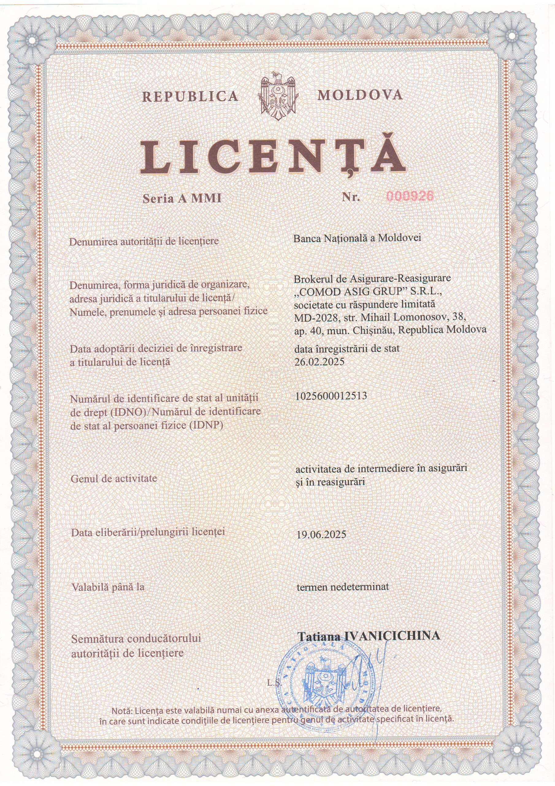 BROKERUL DE ASIGURARE-REASIGURARE COMOD ASIG GRUP SRL este o companie nouă pe piața asigurărilor din Republica Moldova, care a fost fondată din necesitatea de a continua deservirea clienților la un nivel înalt, comod, sigur și rapid. Fondatorul companiei are o experiență de peste 8 ani în domeniul asigurărilor și o atîrnare deosebită față de fiecare client în parte. Apelează la B.A.R. Comod Asig Grup SRL și comandă asigurarea de care ai nevoie, vei avea parte de cele mai bune oferte, vei primi consultație profesionistă în cazul apariției situațiilor de accident